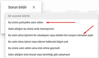 - Buradan Bu ürünü yanlışlıkla satın aldım veya Bu satın alma işlemini bir arkadaşım veya aileden biri onayım olmadan yaptı seçeneklerinden birini seçin. İkincisini tavsiye ederim.