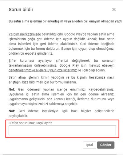 - Lütfen sorununuzu açıklayın bölümüne, bu alışverişi sizin yapmadığınızı ve çocuğunuzun sizin haberiniz olmadan yanlışlıkla satın aldığını belirten bir açıklama yazın ve Gönder butonuna tıklayın.