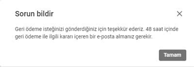 - Google size 48 saat içerisinde geri dönüş yapacaktır. Eğer işleminiz onaylanırsa paranız iade edilecektir.