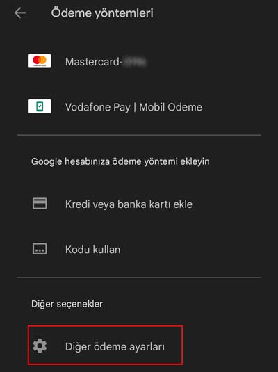 - Aşağıdaki Diğer ödeme ayarları seçeneğine dokunun. Sizi tarayıcı ile ödeme merkezi sayfasına yönlendirecektir.