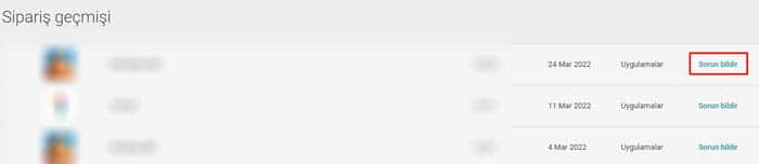 - Listeden hatalı olan alışverişinizi bulun ve sağ tarafta bulunan Sorun bildir yazısına tıklayın.